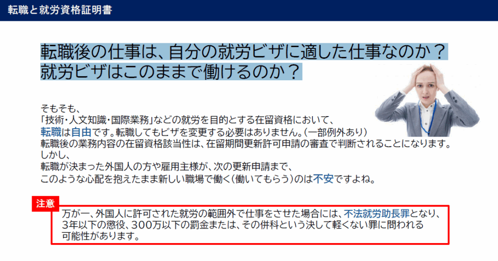 転職後の仕事は、自分の就労ビザに適した仕事なのか?就労ビザはこのままで働けるのか? 2025 8/02 コラム 2025年2月2日2025年8月2日 コラム よかったらシェアしてね! URLをコピーしました! URLをコピーしました! コメント コメントする コメントをキャンセルコメント ※ 名前 ※ メール ※ サイト 次回のコメントで使用するためブラウザーに自分の名前、メールアドレス、サイトを保存する。